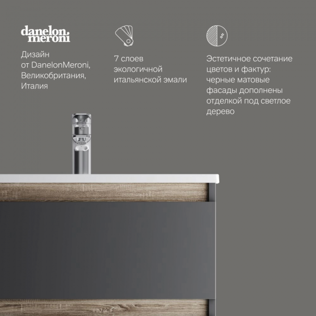 Впервые на рынке – дизайнерская коллекция сантехники которую может позволит себе каждый. Самое эстетичное сочетание цветов и фактур от дизайн-бюро Danelon Meroni (Великобритания & Италия): черные матовые фасады дополнены отделкой с фактурой под темное дерево.