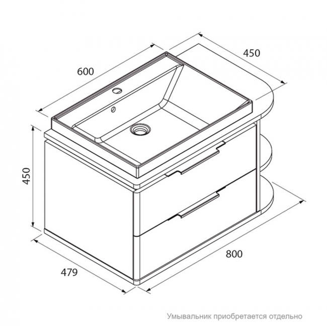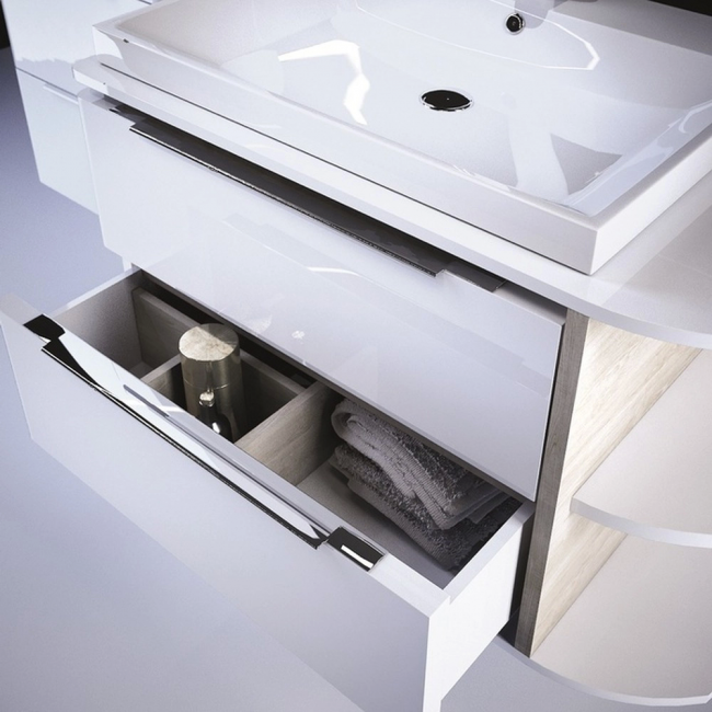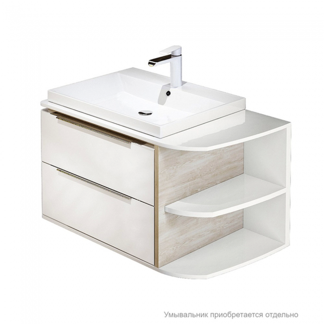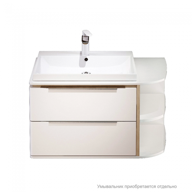 Тумба для ванной комнаты, подвесная. Размеры: 479х800х450 мм (ДхШхВ). Фасад МДФ 16 мм в эмали, боковины ЛДСП белый глянец/под дерево. Два выдвижных ящика с механизмом плавного доведения, 2 открытые закругленные полки.Перекатной организатор в нижнем ящике.Упаковка: картон, пленка, пенопластовые уголки. Подходит умывальник 0066000i28.