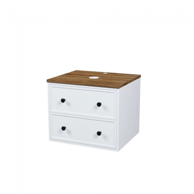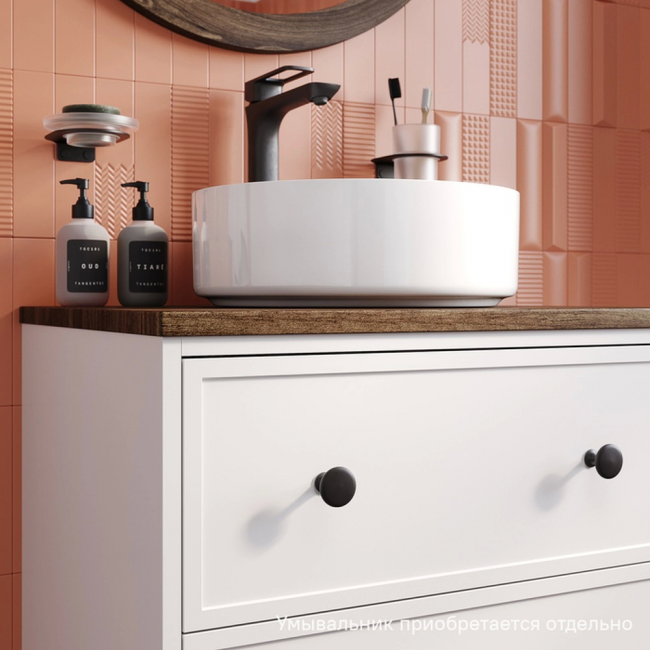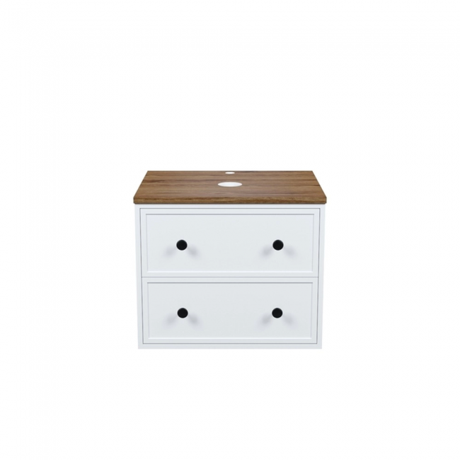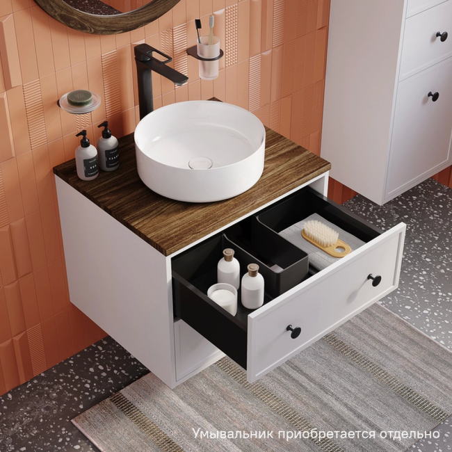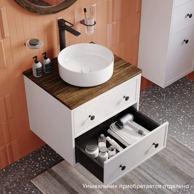 Компактная подвесная тумба Torr классического молочно-белого цвета со столешницей из МДФ в оттенке ореха макадамия. Сочетает в себе узнаваемый стиль и практичность популярного скандинавского дизайна. Ее четкие формы, теплый цвет дерева, фасады с декоративной филенкой, круглые ручки смотрятся гармонично и впишутся в любой современный интерьер. Подойдет любой накладной умывальник, покупается отдельно. Два просторных выдвижных ящика закрываются плавно и бесшумно благодаря высококачественным скрытым направляющим с доводчиками Hettich. Внутри ящики графитового цвета – стильно и практично. Многослойное покрытие матовой эмалью, предназначенной для использования в помещениях с высокой влажностью, позволит сохранить первоначальный вид мебели надолго (при должном уходе). Надежная фурнитура Hettich рассчитана на 30 000 открываний – это более 10 лет исправной работы.Гарантия на мебель IDDIS® – 3 года.