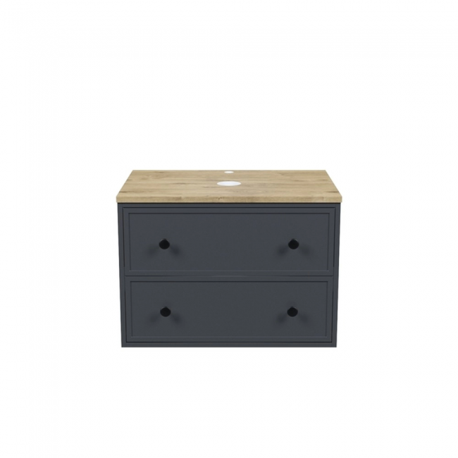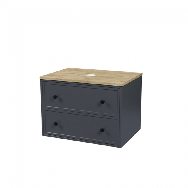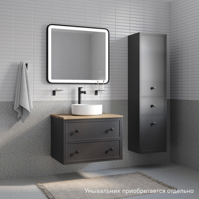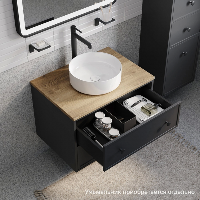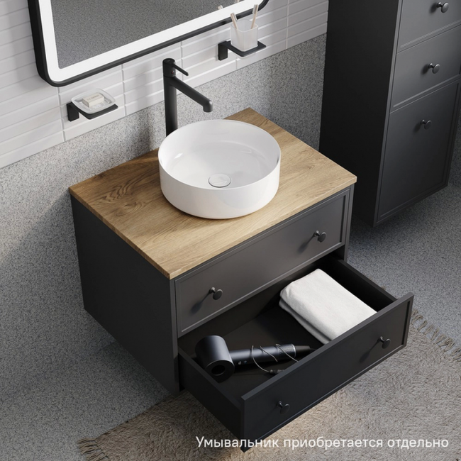 Компактная подвесная тумба Torr трендового темно-серого цвета со столешницей из МДФ в оттенке дуба верона. Сочетает в себе узнаваемый стиль и практичность популярного скандинавского дизайна. Ее четкие формы, теплый цвет дерева, фасады с декоративной филенкой, круглые ручки смотрятся гармонично и впишутся в любой современный интерьер. Подойдет любой накладной умывальник, покупается отдельно. Два просторных выдвижных ящика закрываются плавно и бесшумно благодаря высококачественным скрытым направляющим с доводчиками Hettich. Внутри ящики графитового цвета – стильно и практично. Покрытие качественной влагостойкой пленкой, разработанной для использования в помещениях с высокой влажностью, сохранит первоначальный вид мебели надолго (при должном уходе). Надежная фурнитура Hettich рассчитана на 30 000 открываний – это более 10 лет исправной работы.Гарантия на мебель IDDIS® – 3 года.