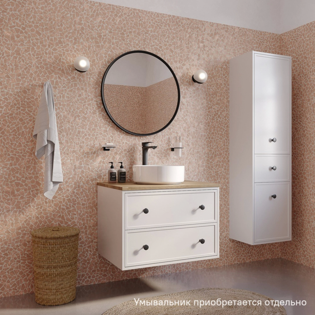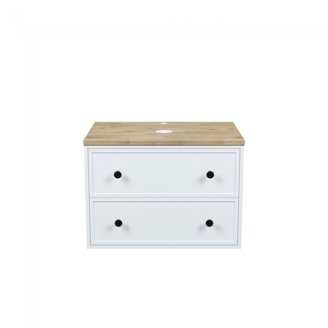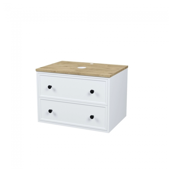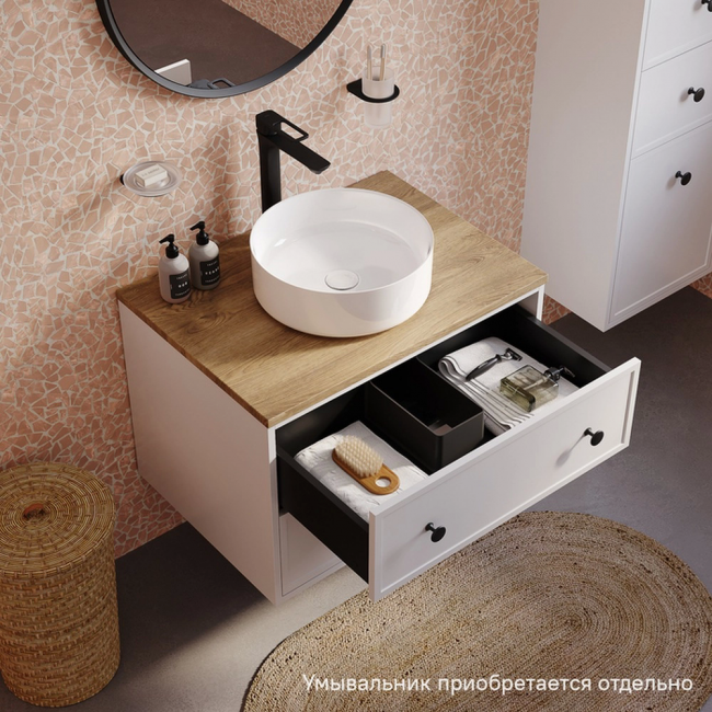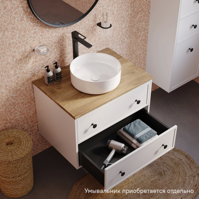 Компактная подвесная тумба Torr классического молочно-белого цвета со столешницей из МДФ в оттенке дуба верона. Сочетает в себе узнаваемый стиль и практичность популярного скандинавского дизайна. Ее четкие формы, теплый цвет дерева, фасады с декоративной филенкой, круглые ручки смотрятся гармонично и впишутся в любой современный интерьер. Подойдет любой накладной умывальник, покупается отдельно. Два просторных выдвижных ящика закрываются плавно и бесшумно благодаря высококачественным скрытым направляющим с доводчиками Hettich. Внутри ящики графитового цвета – стильно и практично. Многослойное покрытие матовой эмалью, предназначенной для использования в помещениях с высокой влажностью, позволит сохранить первоначальный вид мебели надолго (при должном уходе). Надежная фурнитура Hettich рассчитана на 30 000 открываний – это более 10 лет исправной работы.Гарантия на мебель IDDIS® – 3 года.