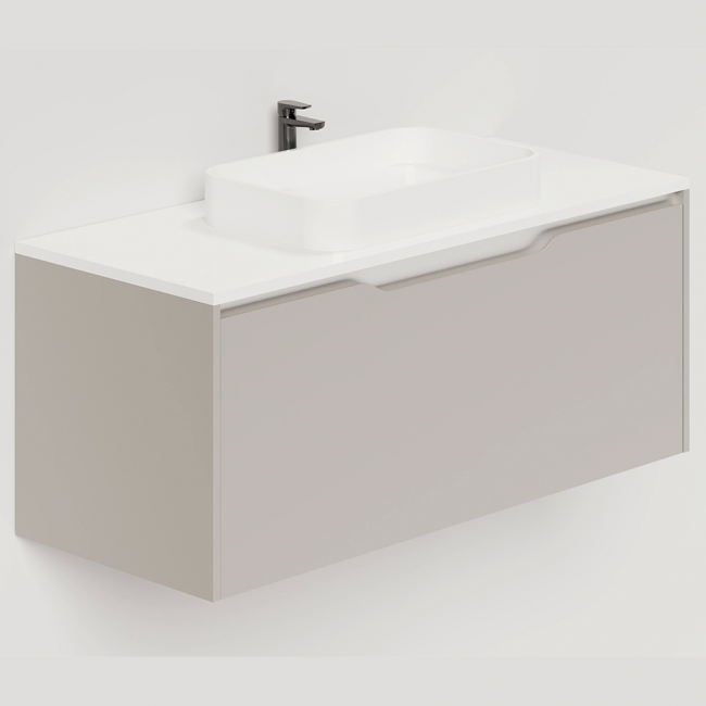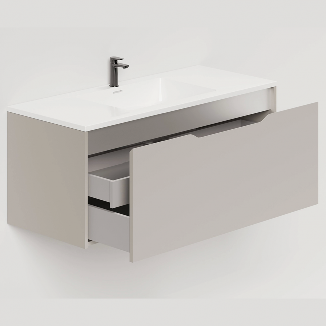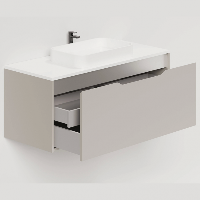 В тумбе 2 ящика: вместительное нижнее отделение открывается с помощью интегрированной ручки на фасаде, а скрытый внутренний верхний ящик открывается с помощью системы push-to-open