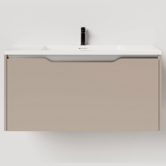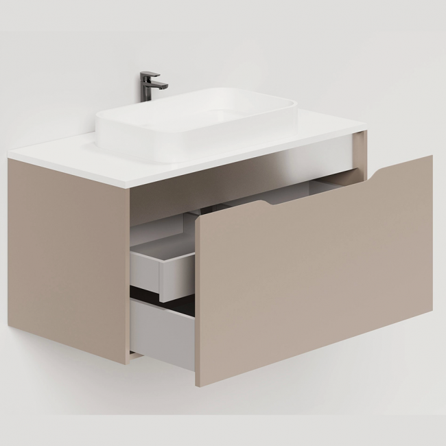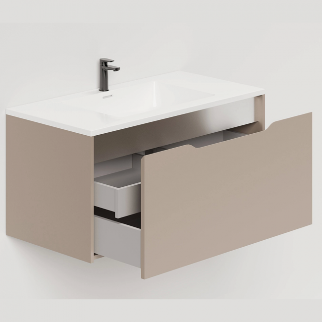 В тумбе 2 ящика: вместительное нижнее отделение открывается с помощью интегрированной ручки на фасаде, а скрытый внутренний верхний ящик открывается с помощью системы push-to-open