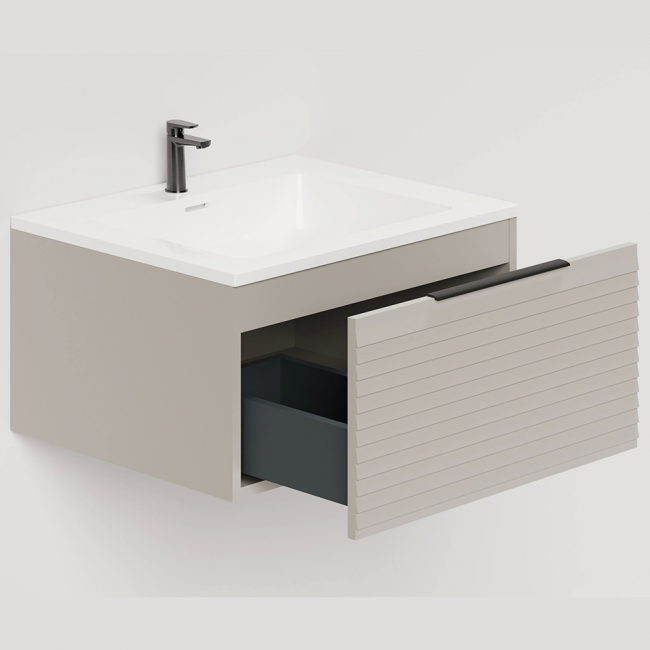Влагостойкие материалы: ящик тумбы выполнен из влагостойкой ламинированной плиты, фасады выполнены из МДФ и с двух сторон покрыты эмалью для дополнительной защиты от влаги