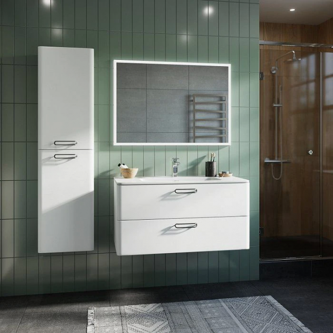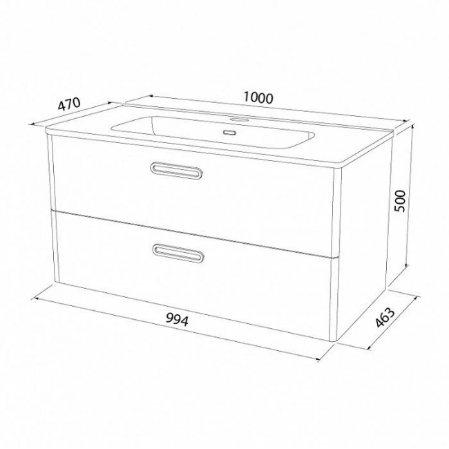 Тумба с умывальником для ванной комнаты, подвесная. Размеры тумбы без умывальника: 467х1002х500 мм (ДхШхВ). Размеры умывальника: 460х1000 мм (ДхШ). Фасад МДФ 19 мм в эмали (белый глянец), фрезеровка. Корпус ЛМДФ 16 мм в эмали. Черные сатиновые ручки. Два выдвижных ящика с механизмом плавного доведения. Пластиковый ограничитель под сифон в верхнем ящике. Перекатной организатор в нижнем ящике. Навесы усиленные с планкой. Упаковка: картон, пленка, пенопластовые уголки.
