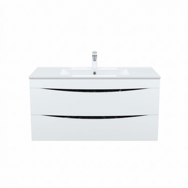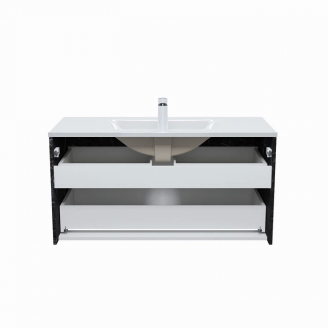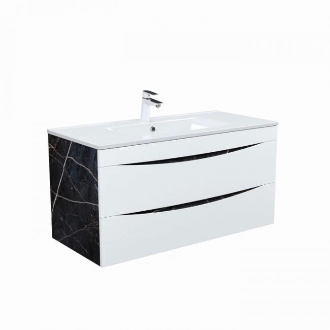 Стильная подвесная тумба Cloud из влагостойкой ЛДСП, где гармонично сочетаются боковины под черный мрамор, матовые белые фасады с интегрированными ручками и тонкий умывальник. Обновление популярной коллекции мебели Cloud и украшение современной ванной.