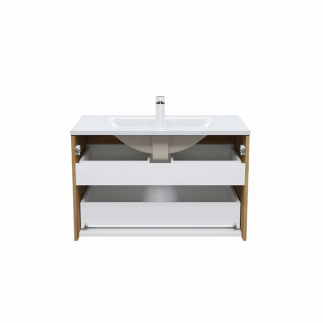 Стильная подвесная тумба Cloud из влагостойкой ЛДСП, где гармонично сочетаются боковины цвета золотистого дуба, матовые белые фасады с интегрированными ручками и тонкий умывальник. Обновление популярной коллекции мебели Cloud и украшение современной ванной в стиле лофт.