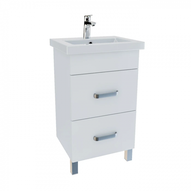 Напольная тумба New Custo сияющего белого цвета – функциональное решение для тех, кто привык рационально использовать пространство. Благодаря компактному размеру (ширина всего 455 мм) тумба подойдет даже для небольших ванных. В комплекте тумбы накладной фарфоровый умывальник эргономичной формы. • Фасад и корпус тумбы изготовлены из белого МДФ и ЛДСП, пригодных для использования во влажных помещениях (при соблюдении правил эксплуатации и ухода), и покрыты несколькими слоями грунта и эмали. Благодаря этому мебель надолго сохранит свой первоначальный вид – как в день покупки.• Умывальник из качественного фарфора отличается высокой прочностью и простотой в уходе – он не задерживает загрязнения и неприятные запахи, надолго сохраняя первозданную белизну. • Два выдвижных ящика с механизмом плавного доведения и перекатной организатор в нижнем ящике – для удобного хранения полезных мелочей. Ящики закрываются плавно и бесшумно – благодаря высококачественным скрытым направляющим с доводчиками немецкого производства.