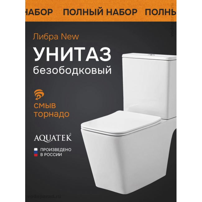 Унитаз-компакт напольный безободковый с бачком AQUATEK ЛИБРА NEW AQ1263NT-00, 635*385*820мм, смыв ТОРНАДО, горизонтальный выпуск, тонкое сиденье с механизмом плавного закрывания, крепеж купить с доставкой. 100% Оригинал. Гарантия!