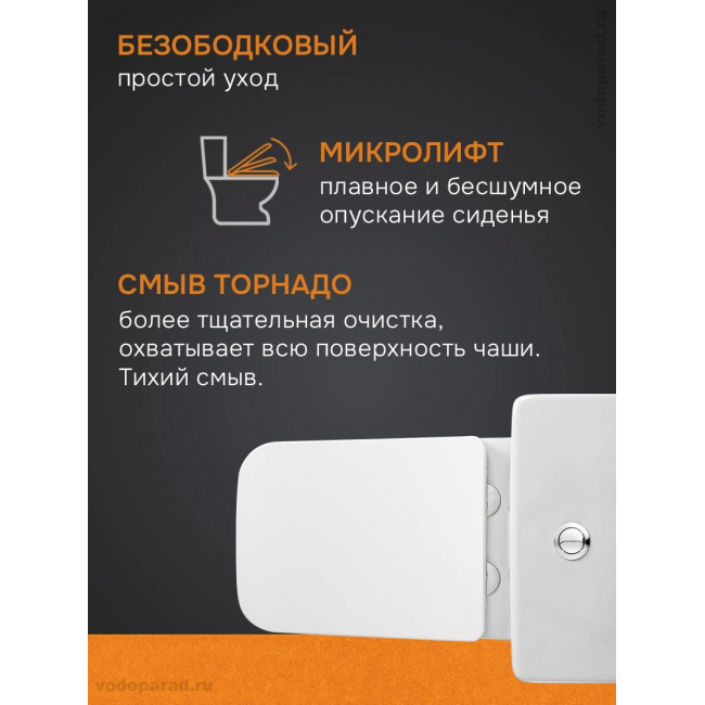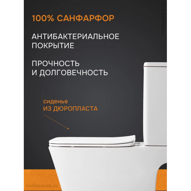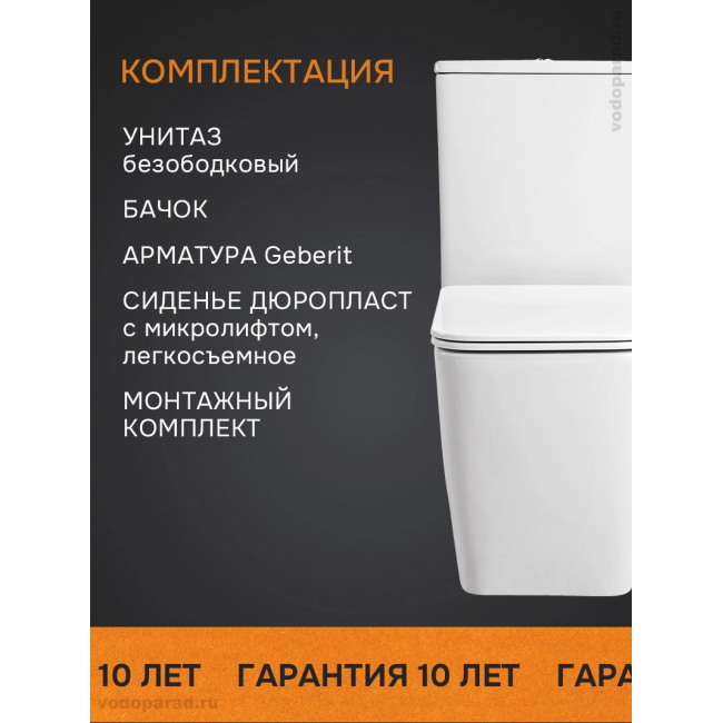 | Комплектация | унитаз-компакт, тонкое сидение, крышка с микролифтом, крепление, бачок, крышка бачка, арматура смыва |