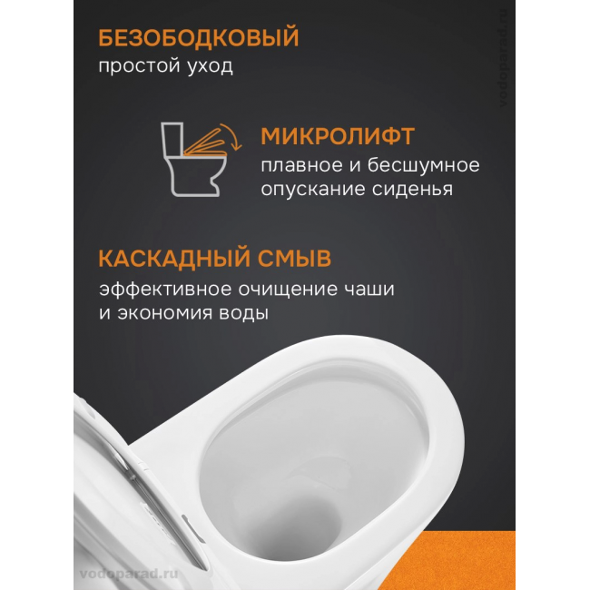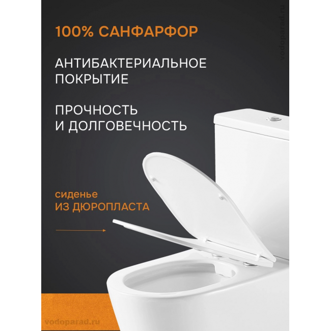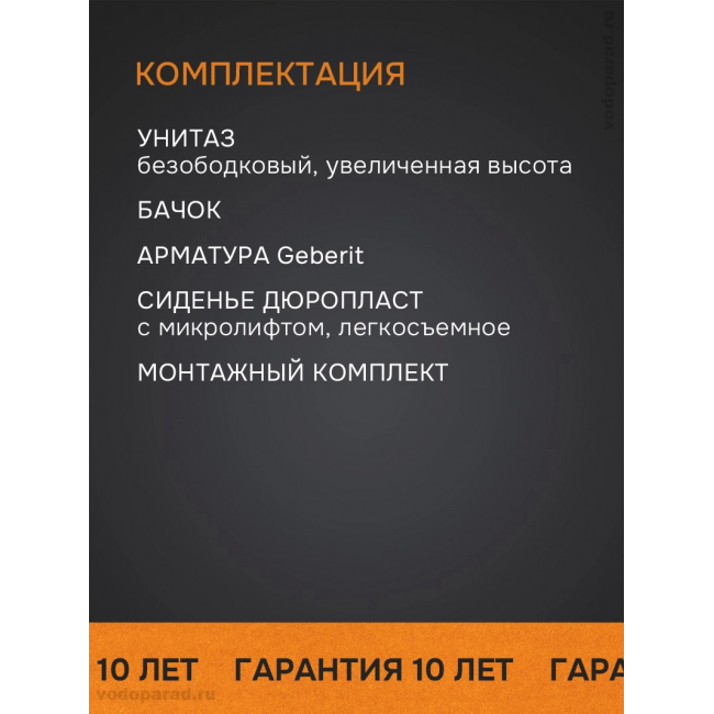 | Комплектация | унитаз-компакт, тонкое сидение, крышка с микролифтом, крепление, бачок, крышка бачка, арматура смыва |