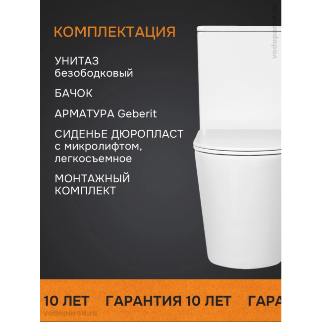 | Комплектация | унитаз-компакт, тонкое сидение, крышка с микролифтом, крепление, бачок, крышка бачка, арматура смыва |