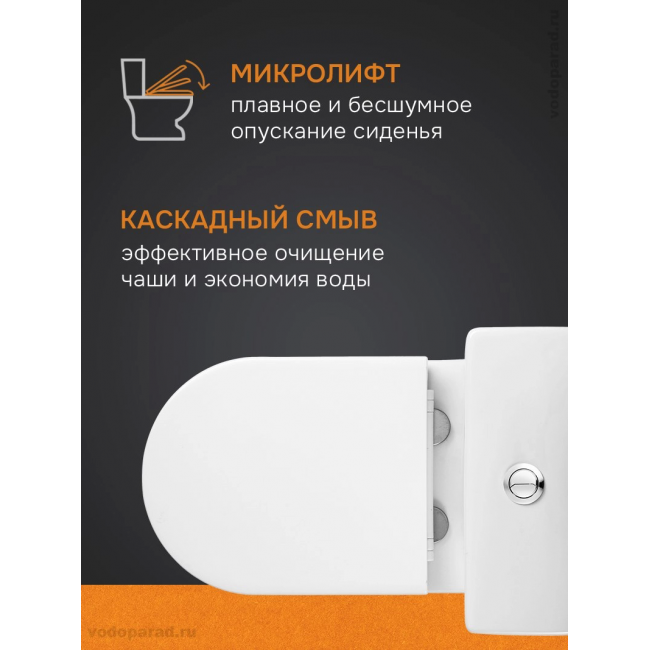 Унитаз Aquatek изготовлен из 100% санитарного фарфора, который сохраняет безупречную белизну на протяжении всего срока службы. Двойной режим смыва позволяет экономно расходовать воду. Сливная арматура бачка рассчитана на 200 000 циклов использования. Сиденье легко снимается для уборки одним нажатием кнопки. Механизм Soft Close обеспечивает плавное закрытие крышки унитаза.