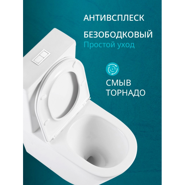 Отсутствие ободка предотвращает накопление грязи и бактерий, что значительно упрощает уход за унитазом и повышает уровень гигиеничности. Удобная форма чаши и уникальная система смыва "торнадо" гарантируют мощный и эффективный смыв, минимизируя расход воды, и исключают разбрызгивание.
