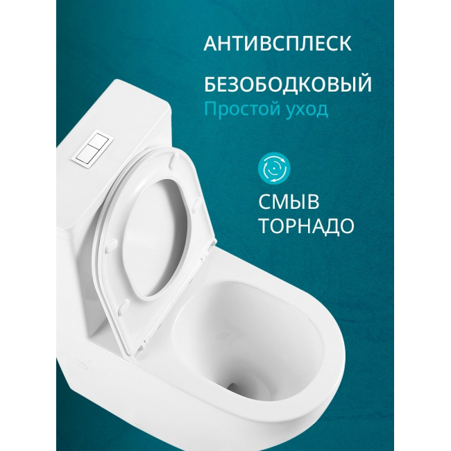 Отсутствие ободка предотвращает накопление грязи и бактерий, что значительно упрощает уход за унитазом и повышает уровень гигиеничности. Удобная форма чаши и уникальная система смыва "торнадо" гарантируют мощный и эффективный смыв, минимизируя расход воды, и исключают разбрызгивание.