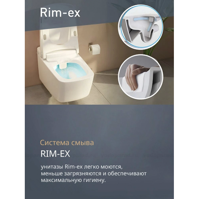 - Унитазы выполнены по безободковой технологии Rim-Ex, что делает их на 95% более гигиеничными