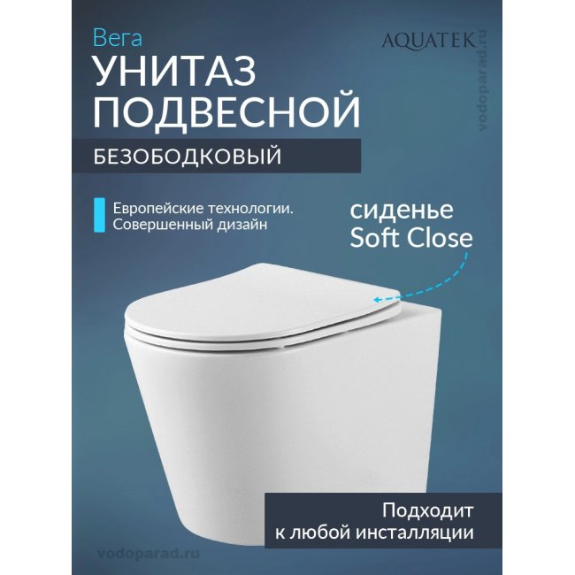 Унитаз-компакт подвесной Aquatek Вега AQ1904-00 тонкое сиденье soft close купить с доставкой. 100% Оригинал. Гарантия!