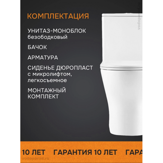 Современный и гигиеничный унитаз-моноблок безободковый с системой смыва Tornado и крышкой-сиденьем из дюропласта (Soft-Close) сочетает в себе эргономичный дизайн и инновационные технологии. Ключевые особенности:✔ Безободковая конструкция – упрощает уход, предотвращает скопление бактерий и грязи.✔ Система смыва Tornado – мощный и бесшумный смыв для идеальной чистоты.✔ Крышка-сиденье из дюропласта – повышенная износостойкость, устойчивость к царапинам и воздействию химических средств.✔ Механизм Soft-Close – плавное опускание сиденья без стука и шума.✔ Напольный монтаж – надежная и простая установка.✔ Чаша унитаза находится в одном корпусе со смывным бачком - максимальная герметичность и удобство монтажа.✔ Оригинальный моноблочный дизайн –компактная форма, гармонично вписывающаяся в современный интерьер.✔ Экономичный расход воды – соответствует современным экологическим стандартам.Идеальное решение для комфортной ванной комнаты!
