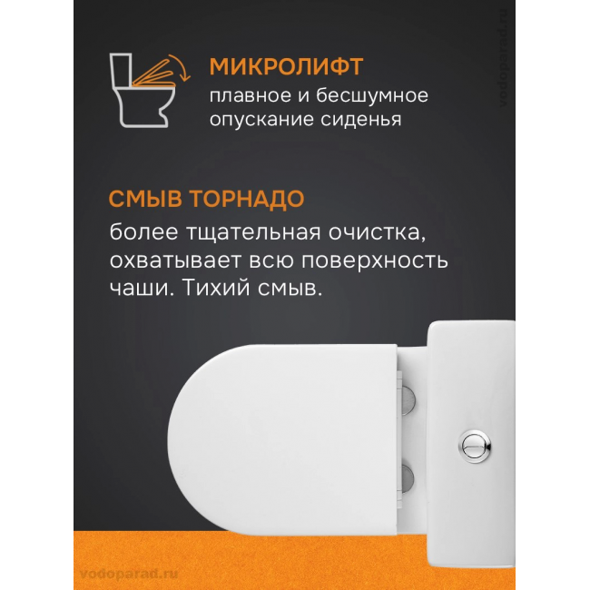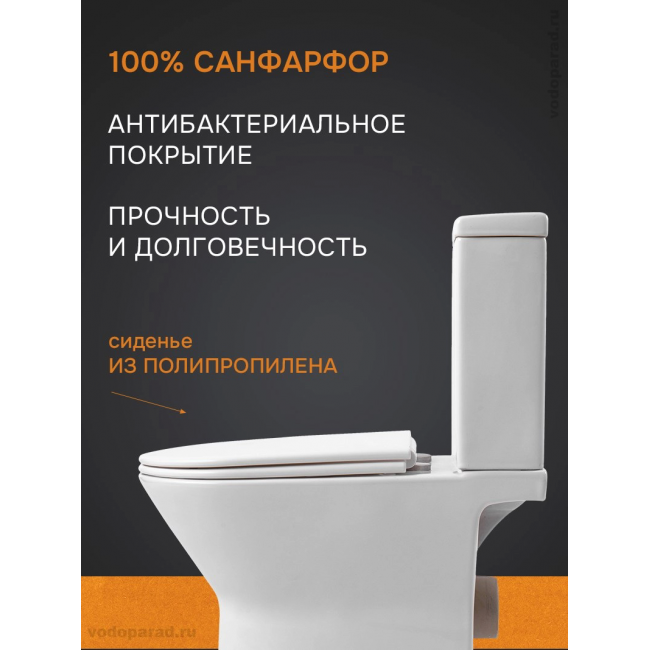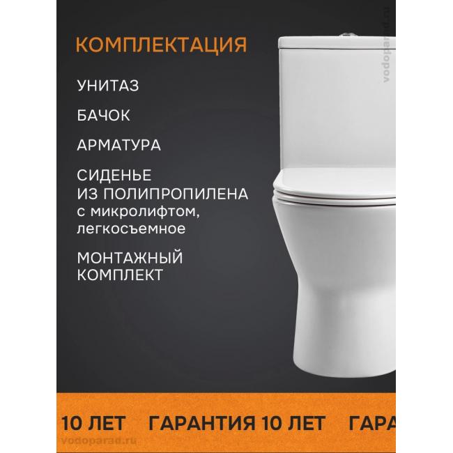 | Комплектация | унитаз-компакт, тонкое сидение, крышка с микролифтом, крепление, бачок, крышка бачка, арматура смыва |