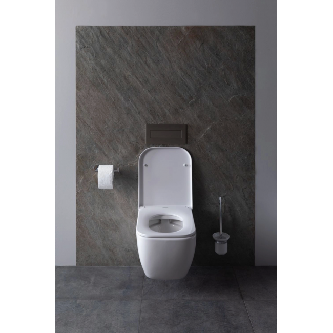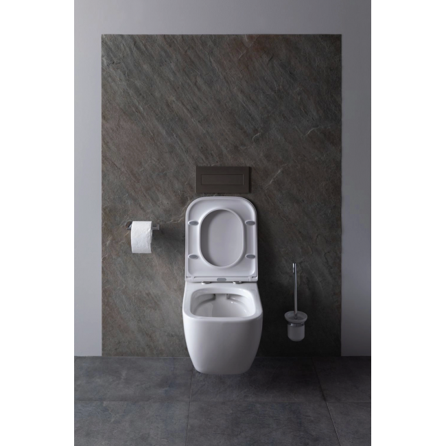 Прямоугольный подвесной унитаз с мягкими углами Allen Brau Infinity белого цвета в стиле модерн — находка для любителей строгих форм и исполнений. В комплекте с унитазом идет крышка-сиденье из дюропласта в цвет керамики самого устройства. Поверхность изделия глянцевая, а механизм смыва определяется системой инсталляции, встроенной в стену. Решение выглядит технологично и минималистично. Унитаз безободковый, с покрытием антигрязь и горизонтальным направлением выпуска. Подойдет модель для любых интерьерных решений, даже для классики, если дизайнер разработает подходящую концепцию для воплощения. Благодаря компактным размерам 360х510х350 мм будет органично смотреться как на большом пространстве, так и на малой площади санузла.