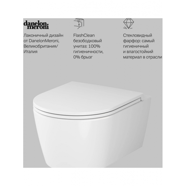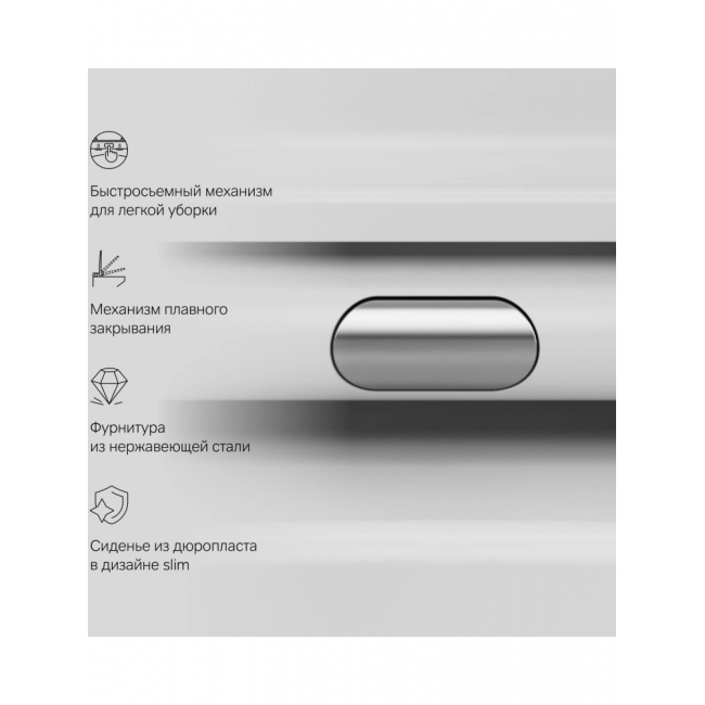 унитаз произведен из стекловидного фарфора - гигиеничного материала, а быстросъемное сиденье, созданное из дюропласта, не оставляет царапин.