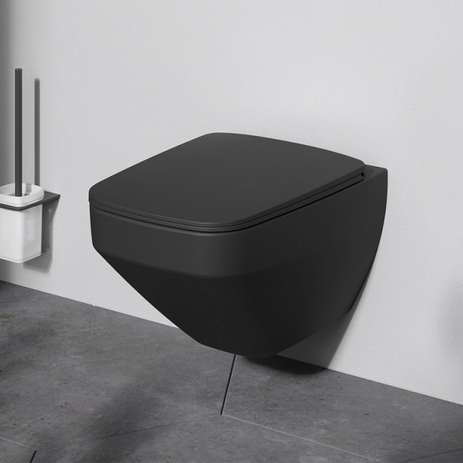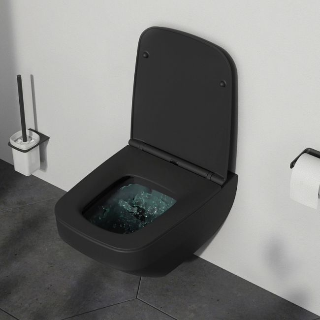 Современный дизайн и новая квадратная форма в керамике АМ.РМ. Теперь и в черном матовом исполнении. FlashClean — новое поколение безободковых унитазов без использования пластика: 100 % гигиеничности 0% брызг.