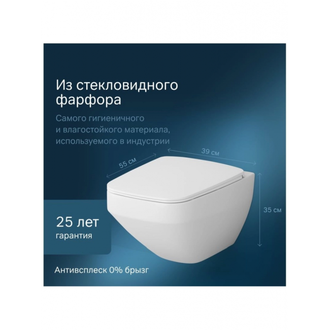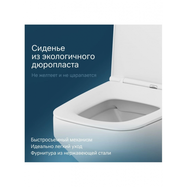 влагостойкий стекловидный фарфор, скрытые крепления и фановый выход позволяют проводить уборку без лишних усилий, а быстросъемное дюропластовое сиденье защищает поверхность от мелких повреждений.