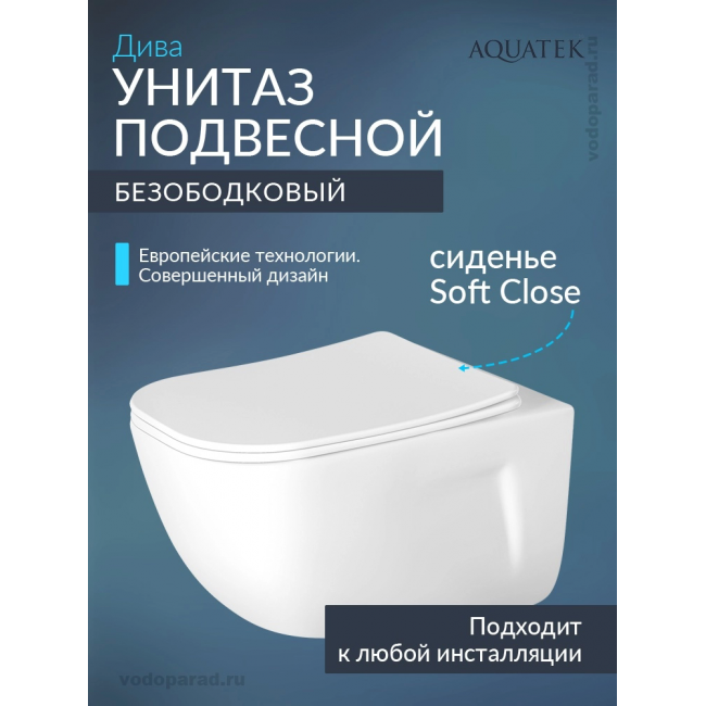 Унитаз подвесной с сиденьем микролифт Aquatek Дива AQ2012-00 безободковый купить с доставкой. 100% Оригинал. Гарантия!