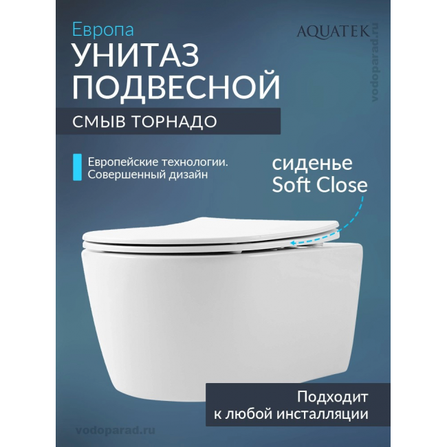 Унитаз подвесной с сиденьем микролифт Aquatek Европа AQ1106T-00 безободковый купить с доставкой. 100% Оригинал. Гарантия!