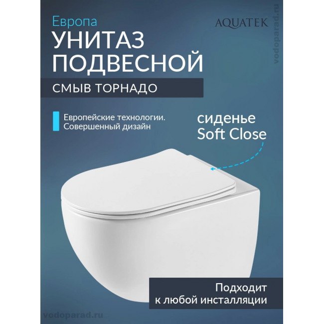 Унитаз подвесной с сиденьем микролифт Aquatek Европа AQ1190T-00 безободковый купить с доставкой. 100% Оригинал. Гарантия!