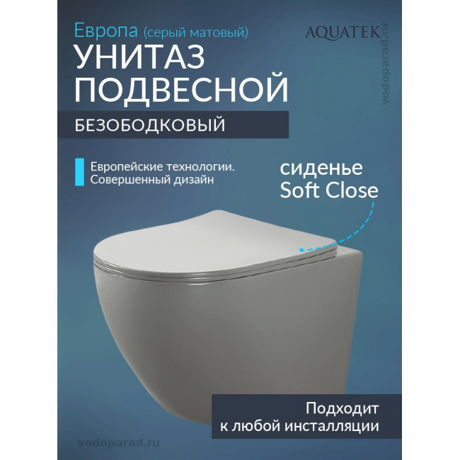 Унитаз подвесной с сиденьем микролифт Aquatek Европа AQ1901-MG безободковый купить с доставкой. 100% Оригинал. Гарантия!