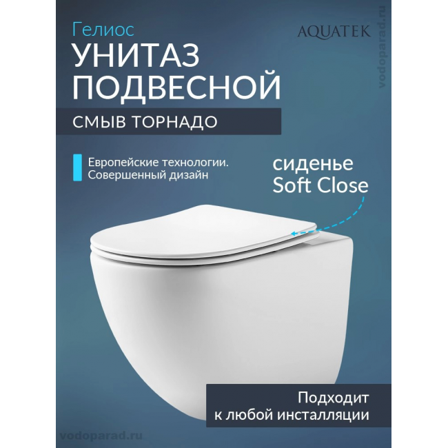 Унитаз подвесной с сиденьем микролифт Aquatek Гелиос AQ1993T-00 безободковый купить с доставкой. 100% Оригинал. Гарантия!