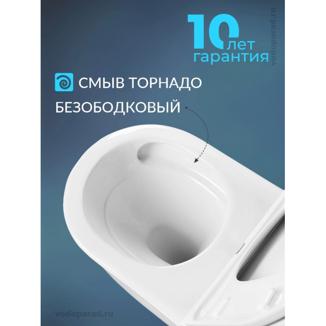 Безободковая конструкция чаши обеспечивает гигиеничность, отсутствие скрытых участков и простоту в уходе. Благодаря смыву Торнадо мощная струя воды создает в чаше унитаза эффект водоворота, который полностью омывает поверхность и исключает выплескивание воды. Унитазы со смывом ТОРНАДО характеризуются низким уровнем шума и отличаются экономичностью, т.к. обеспечивают более эффективный смыв, чем традиционные безободковые и каскадные унитазы при стандартном расходовании воды.