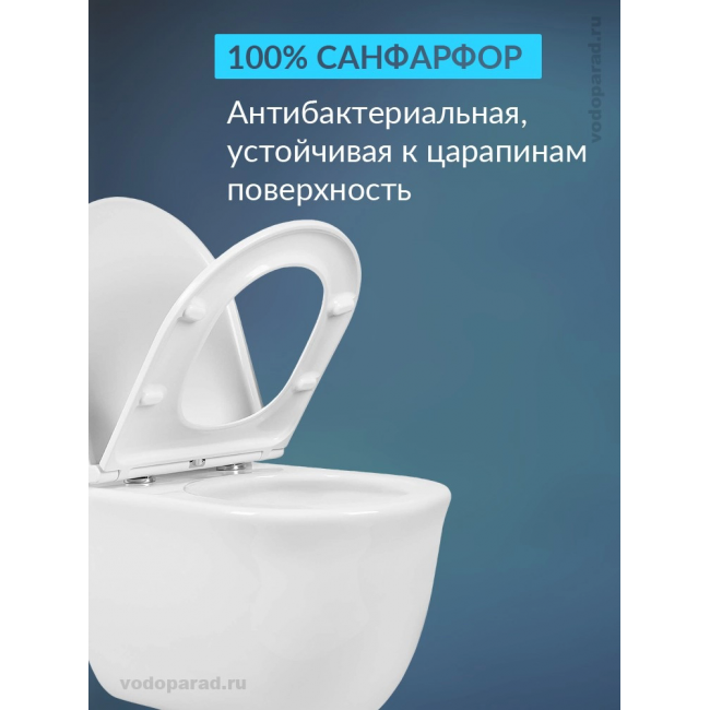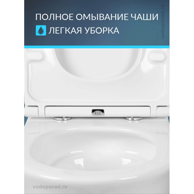 Ультратонкое сиденье из дюропласта устойчиво к царапинам, легко снимается для уборки одним нажатием кнопки. Механизм Soft Close обеспечивает плавное и бесшумное закрытие крышки унитаза, без лишних контактов и усилий.