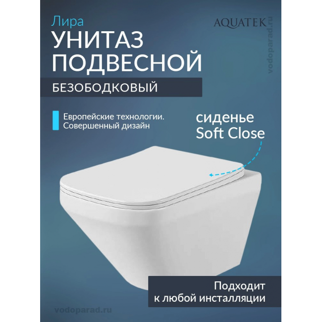 Унитаз подвесной с сиденьем микролифт Aquatek Лира AQ1155-00 безободковый купить с доставкой. 100% Оригинал. Гарантия!