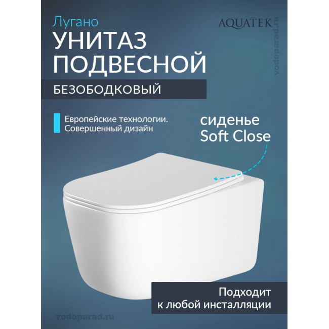 Унитаз подвесной с сиденьем микролифт Aquatek Лугано AQ2002-00 безободковый купить с доставкой. 100% Оригинал. Гарантия!