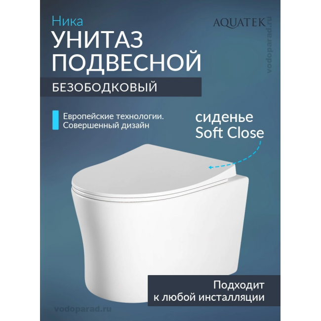 Унитаз подвесной с сиденьем микролифт Aquatek Ника AQ2009-00 безободковый купить с доставкой. 100% Оригинал. Гарантия!