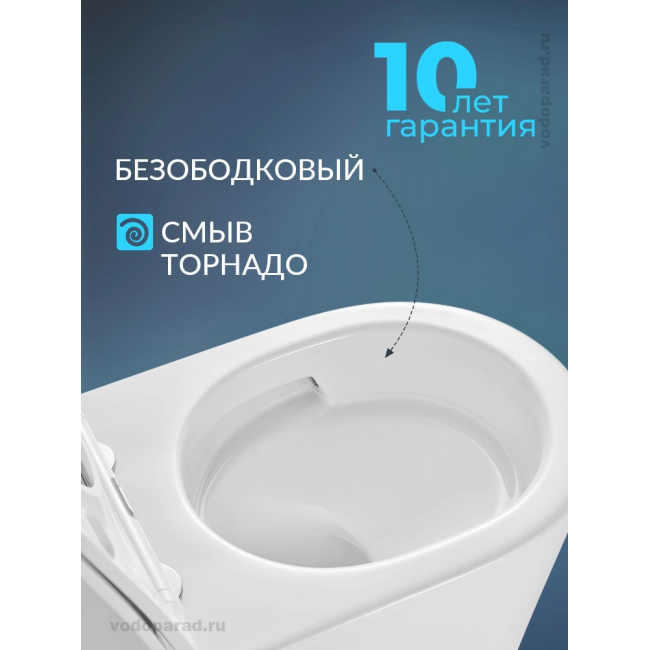 Безободковая конструкция чаши обеспечивает гигиеничность, отсутствие скрытых участков и простоту в уходе. Благодаря смыву Торнадо мощная струя воды создает в чаше унитаза эффект водоворота, который полностью омывает поверхность и исключает выплескивание воды. Унитазы со смывом ТОРНАДО характеризуются низким уровнем шума и отличаются экономичностью, т.к. обеспечивают более эффективный смыв, чем традиционные безободковые и каскадные унитазы при стандартном расходовании воды.