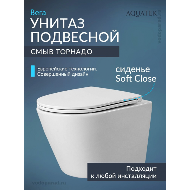 Унитаз подвесной с сиденьем микролифт Aquatek Вега AQ1904T-00 безободковый купить с доставкой. 100% Оригинал. Гарантия!