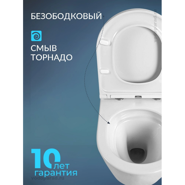Безободковая конструкция чаши обеспечивает гигиеничность, отсутствие скрытых участков и простоту в уходе. Благодаря смыву Торнадо мощная струя воды создает в чаше унитаза эффект водоворота, который полностью омывает поверхность и исключает выплескивание воды. Унитазы со смывом ТОРНАДО характеризуются низким уровнем шума и отличаются экономичностью, т.к. обеспечивают более эффективный смыв, чем традиционные безободковые и каскадные унитазы при стандартном расходовании воды.