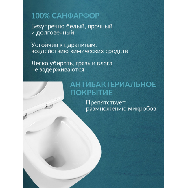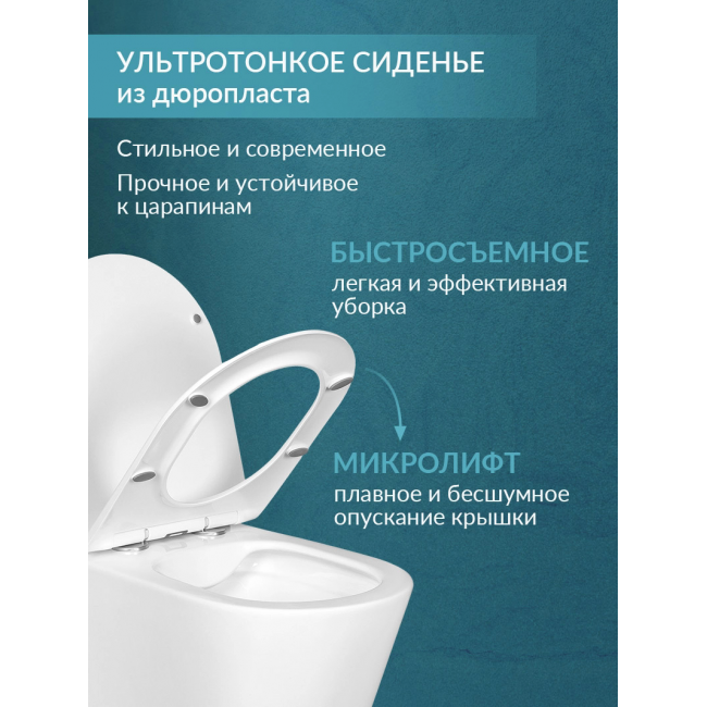 - Ультратонкое сиденье из дюропласта не царапается, остаётся белоснежным на протяжении всего срока службы благодаря повышенной прочности и антибактериальным свойствам материала. Плавное и бесшумное опускание крышки сиденья благодаря микролифту и системе Soft Close обеспечивает комфорт при использовании. Сиденье легко снимается для уборки одним нажатием кнопки и также легко устанавливается обратно. Гарантия на унитаз BENNERI составляет 10 лет, а на сиденье — 2 года.