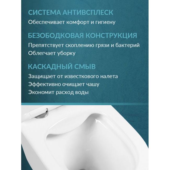 - Безободковая конструкция подвесного унитаза обеспечивает его максимальную гигиену и удобство использования. Безободковый унитаз легко моется, требует меньше усилий и времени по сравнению с традиционными моделями. Кроме того, отсутствие ободка предотвращает скопление микробов и ржавчины, что уменьшает вероятность возникновения неприятных запахов в туалете.
