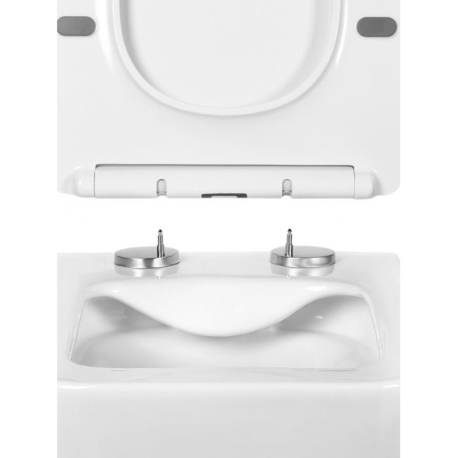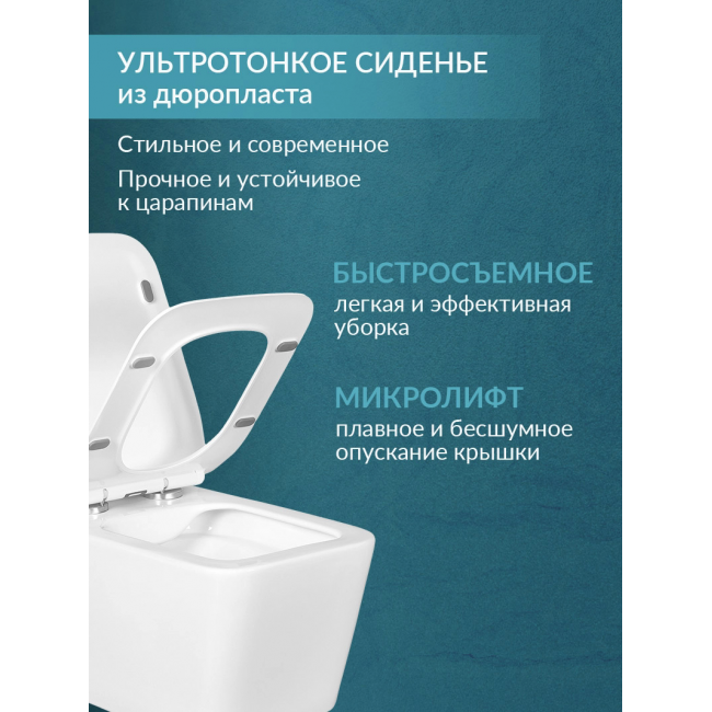 - Ультратонкое сиденье из дюропласта не царапается, остаётся белоснежным на протяжении всего срока службы благодаря повышенной прочности и антибактериальным свойствам материала. Плавное и бесшумное опускание крышки сиденья благодаря микролифту и системе Soft Close обеспечивает комфорт при использовании. Сиденье легко снимается для уборки одним нажатием кнопки и также легко устанавливается обратно. Гарантия на унитаз BENNERI составляет 10 лет, а на сиденье — 2 года.