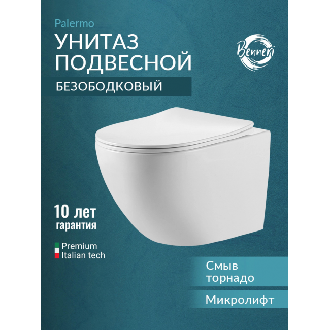 Унитаз подвесной с сиденьем микролифт Benneri Palermo B5.3.1176.00 безободковый купить с доставкой. 100% Оригинал. Гарантия!