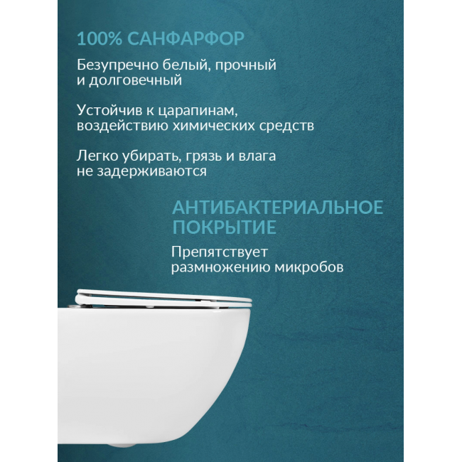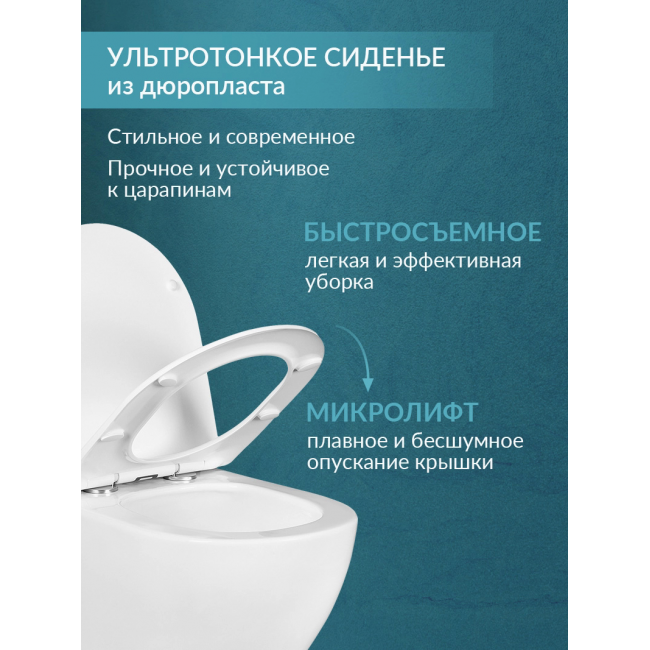- Ультратонкое сиденье из дюропласта не царапается, остаётся белоснежным на протяжении всего срока службы благодаря повышенной прочности и антибактериальным свойствам материала. Плавное и бесшумное опускание крышки сиденья благодаря микролифту и системе Soft Close обеспечивает комфорт при использовании. Сиденье легко снимается для уборки одним нажатием кнопки и также легко устанавливается обратно. Гарантия на унитаз BENNERI составляет 10 лет, а на сиденье — 2 года.