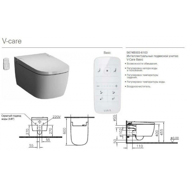 VitrA V-Care 5674B003-6103 Basic – современный подвесной унитаз нового поколения, воплощающий в себе элегантный стиль и высокую функциональность. Модель направлена на эффективное потребление электричества, поэтому все встроенные функции крайне экономичны, не требуют больших энергозатрат. Чаша с проектирована без ободка, поэтому изделие гигиенично и легко очищается от загрязнений. Насадка биде изготовлена из нержавеющей стали и оснащена хромированным наконечником. Устройство автоматически промывается, а также при необходимости легко снимается для ручной чистки.