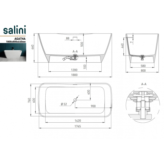 Ванна Salini Agatha 179x82 100221M S-Stone купить с доставкой. 100% Оригинал. Гарантия!