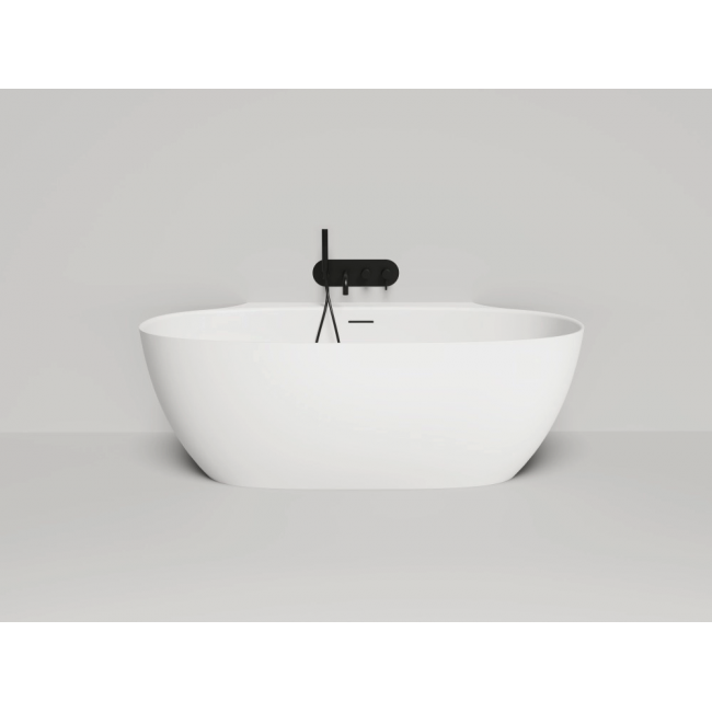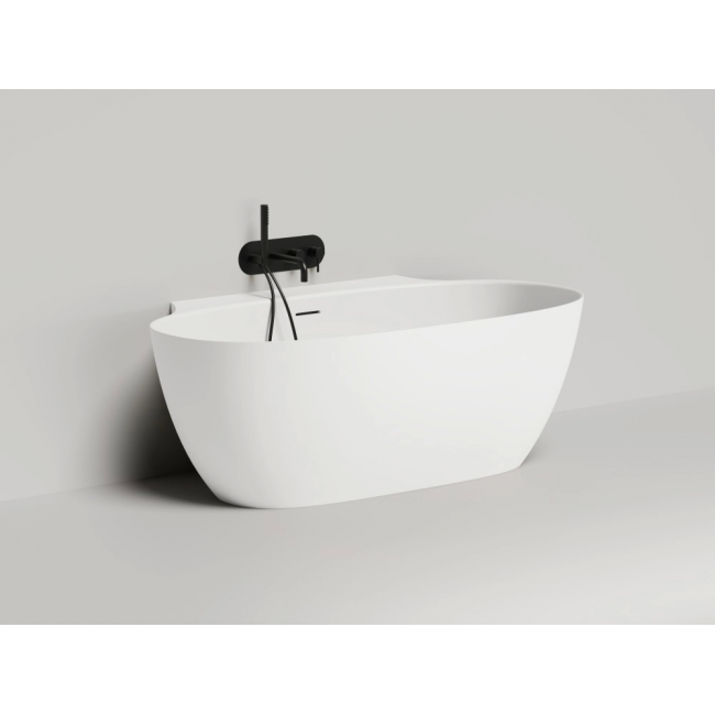 Эта модель соединяет в себе классическую овальную форму изголовий и спрятанный за ними пристенный борт. Благодаря такой конструкции создаётся впечатление отдельностоящей ванны, но сохраняется практичность плотного примыкания к стене и дополнительной поверхности для хранения косметических средств и аксессуаров. При желании здесь также можно разместить и смеситель. Более тонкая, детальная проработка формы чаши позволила уйти от классического понимания пристенной ванны с массивной боковой проекцией: блок, соприкасающийся со стеной, будто утоплен вдоль задней поверхности. Такова новая эстетика облегчённого дизайнерского решения Salini.