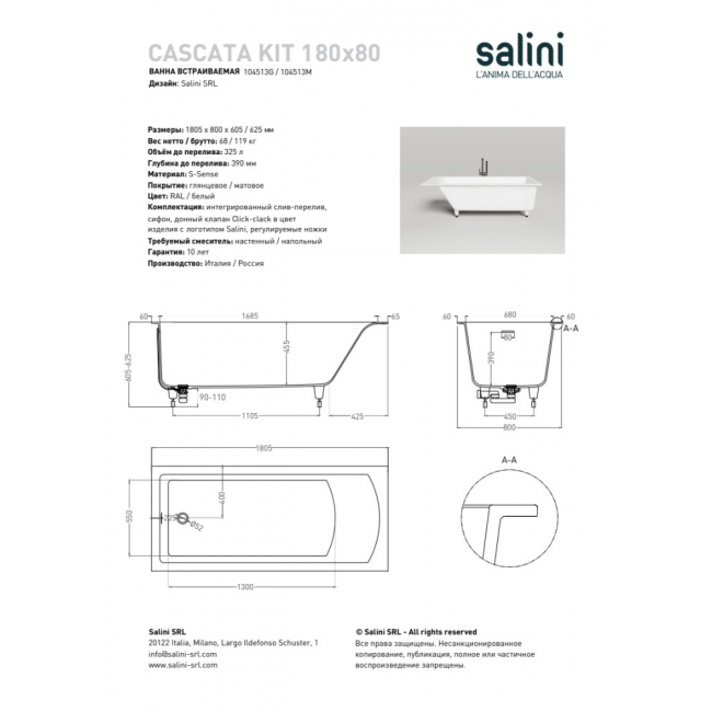 Ванна Salini Cascata Kit 180x80 104523M купить с доставкой. 100% Оригинал. Гарантия!
