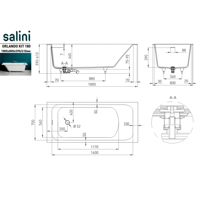 Ванна Salini Orlanda Kit 180x80 102112G S-Sense купить с доставкой. 100% Оригинал. Гарантия!